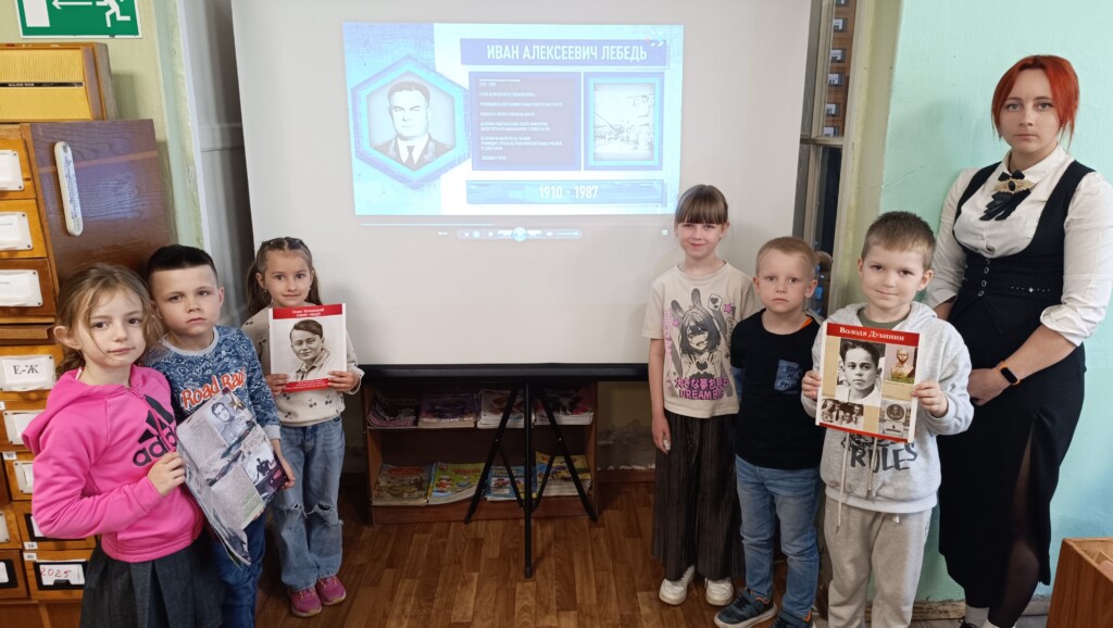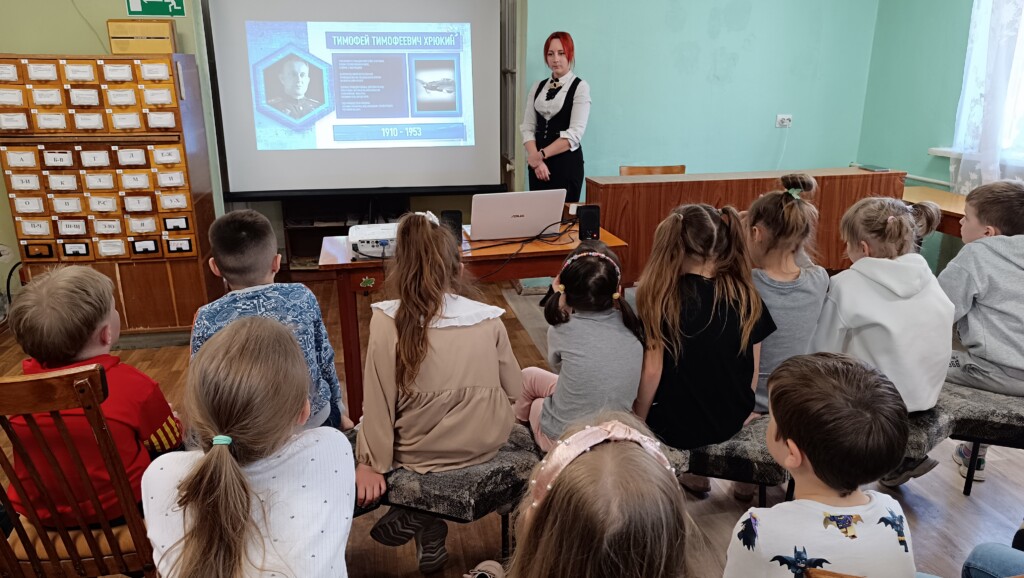 Библиотекарь рассказала о героических поступках лётчика-аса Тимофея Хрюкина, отважного генерал-майора Виктора Лебедева, юного партизана Володи Дубинина и прославленного адмирала Ивана Юмашева.